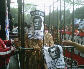 Dalam aksi yang digelar di depan Pintu X SU GBK, Sabtu (26/2/2011), suporter ‘menguburkan’ sosok berkain kafan itu sembari berorasi.