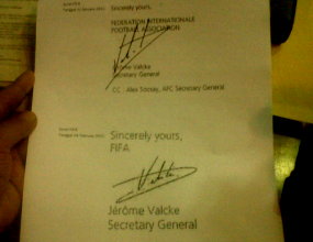 Kopi kedua surat itu juga diserahkan kepada pimpinan sidang dan pihak PSSI. Di situ memang terlihat tanda tangan Jerome Valcke sangat berbeda. Tanda tangan pertama tidak jelas huruf V, dan garis menyampingnya lurus kaku. Sedangkan yang kedua, huruf V lebih jelas, dan garis menyampingnya agak melingkar.